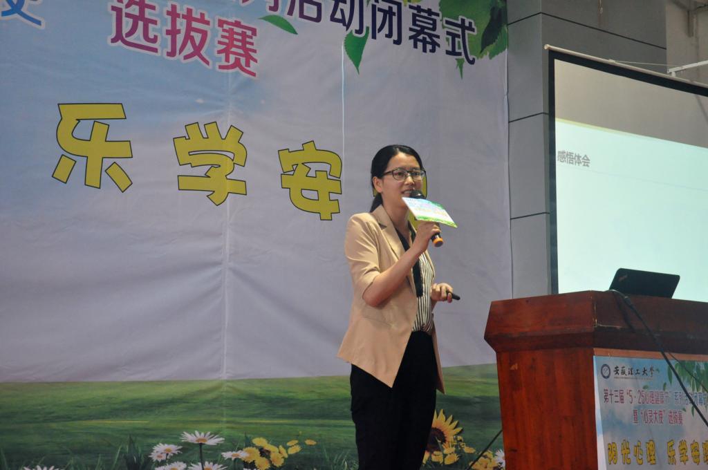 本届心灵大使团团长材料学院辅导员储兆晶老师也在决赛现场分享了她对“阳光心理,乐学安理”的理解。在接下来的一年里,储老师将带领着心灵大使们开展一系列的活动,宣传心理健康知识,营造乐学安理的校园氛围。
