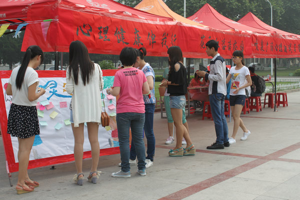 为增强同学们的心理健康意识,树立积极的人生态度,引导广大学生认识自我,学会自我调适及促进学院之间的沟通与交流。由经管学院主办,地环学院、能源学院等六个学院协办的第二届“5•25心理文化节”系列活动在安徽理工大学北校区喷泉广场拉开帷幕。本次心理文化节主要是由体验“心”风尚、领略“心”世界、畅游“心”乐园、感受“心”关怀、共筑“心”色彩、传递“心”温暖、挑战“心”任务等七个环节组成。